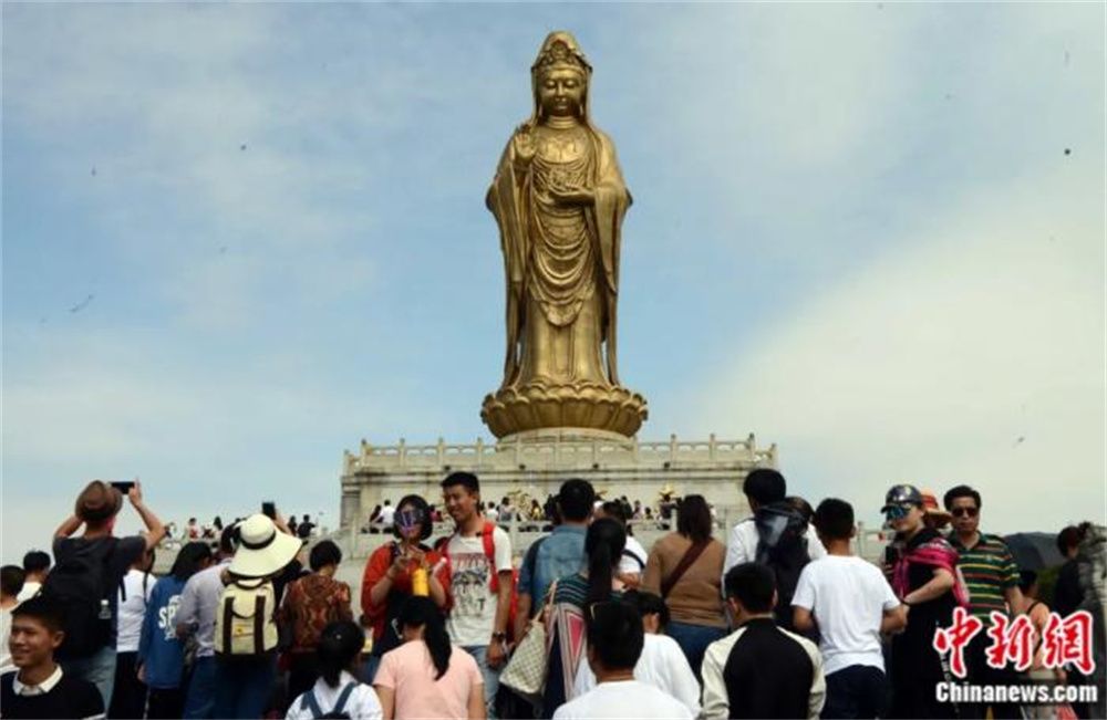浙江舟山普陀山,总高33米的南海观音吸引信众拜谒。