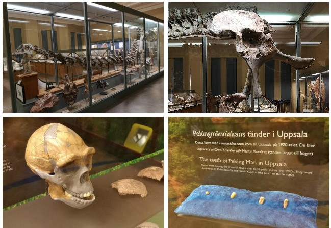 乌普萨拉大学进化博物馆的藏品:师氏盘足龙骨架化石、复原后的北京猿人头盖骨以及牙齿,这是中国古代脊椎动物化石在境外最丰富的收藏。
