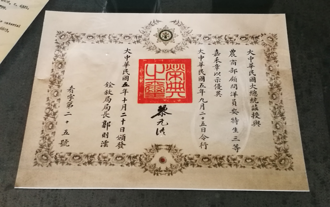 黎元洪为安特生颁发的三等嘉禾奖章证书