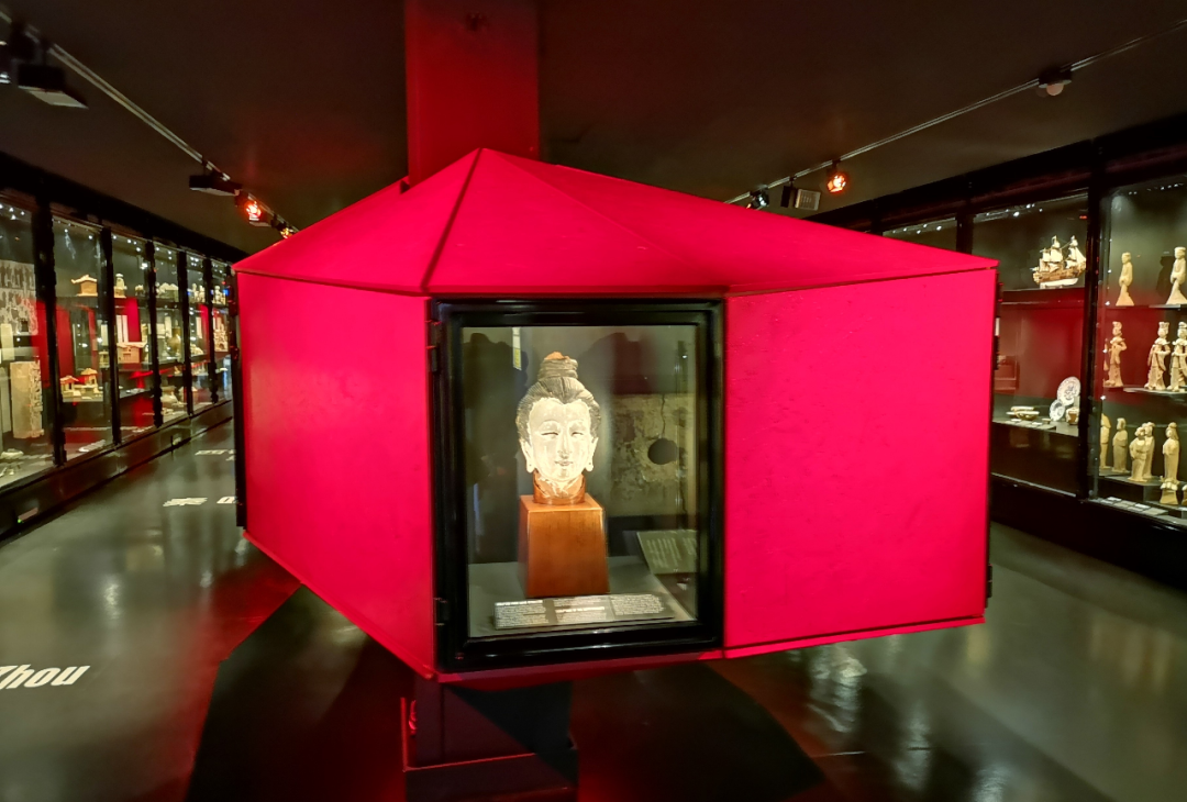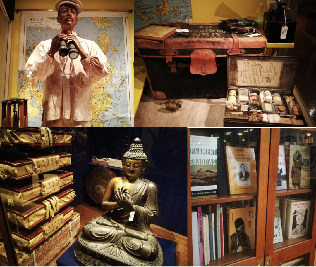 民族学博物馆的藏品:赫定塑像、他的探险用品和收集的佛教用品,以及关于赫定的著作
