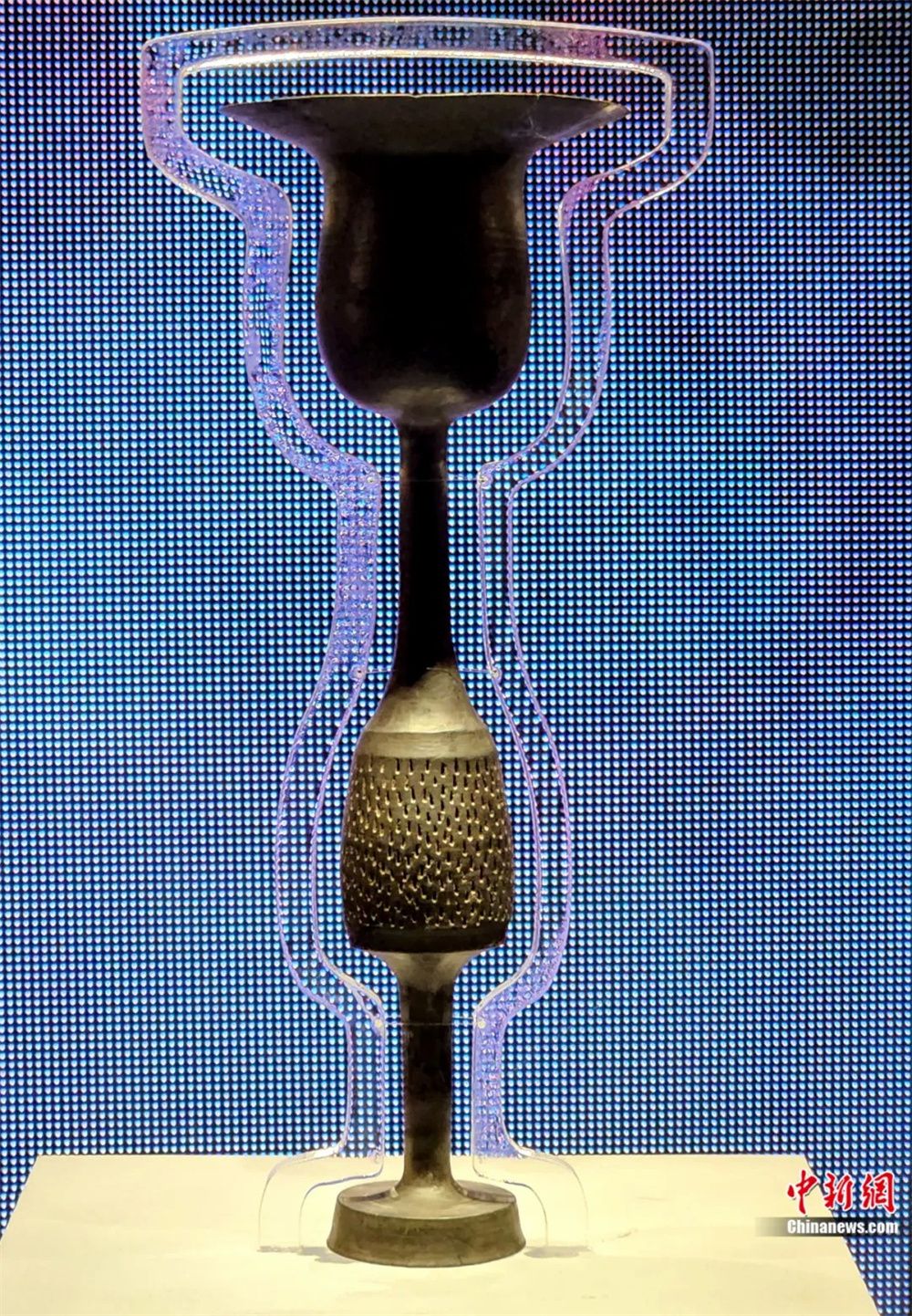 山东博物馆十大“镇馆之宝”之一蛋壳黑陶高柄杯。(图片来源:中新网)