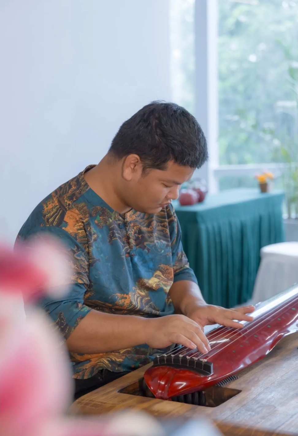 在演奏中,廖文祥所弹奏的《流水》,以其宁静的韵味、湍涌的姿态、舒缓的神韵以及洄游的形态,完美契合了茶文化的精神内涵。