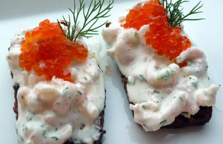 Toast Skagen是瑞典最受欢迎的开胃菜之一,深受美食爱好者的喜爱。它被作为许多餐馆的主菜,深受当地人和外国人的喜爱。最适合在夏季与清凉饮料一起享用。将一片面包烤至松脆,然后将蛋黄酱、调味虾莳萝和柠檬片完美地放在上面,使其呈现出令人垂涎欲滴的外观。通常作为开胃菜冷食。