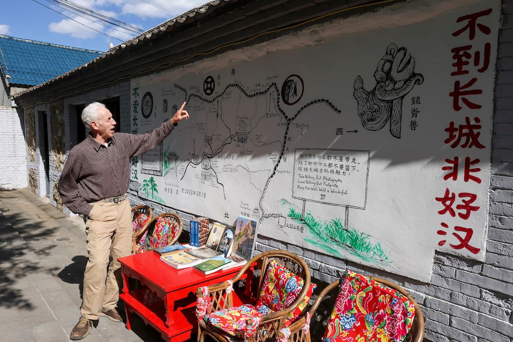 2024年5月,威廉在位于北京怀柔区的小院里讲述长城。(图片来源:中新社)