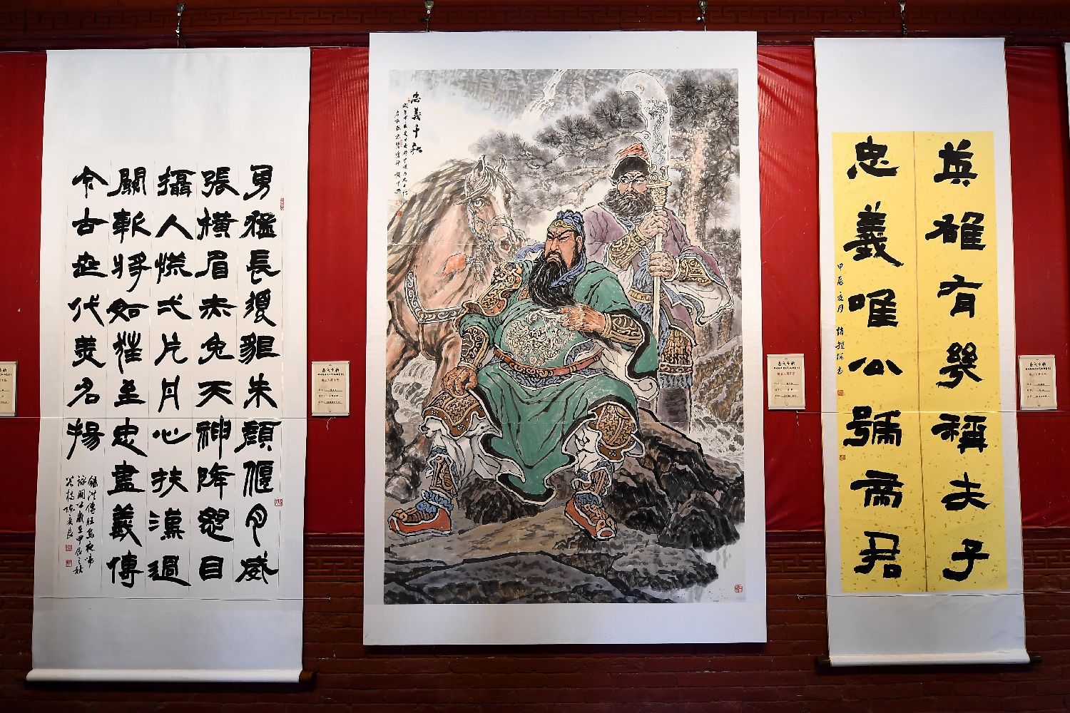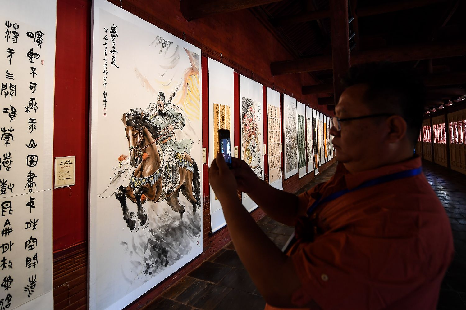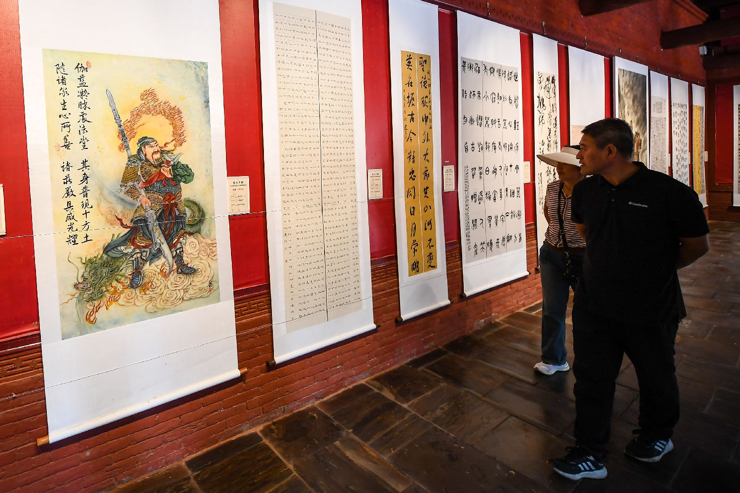 当日,207幅书画作品在解州关帝祖庙午门两侧的碑廊下依次展陈。其中,来自台湾的蔡善宇用书法作品《罗贯中赞关羽诗》彰显关公的英勇形象和忠义精神;来自贵州的杨文军以山为体画关公,作品中一侧写实一侧写意,中间附有书法,一幅《忠义千秋》吸引民众驻足欣赏。