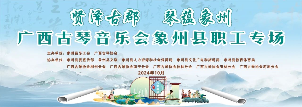 The ancient six patriarchs retreated into seclusion,their virtues blessing us;now,the heritage of intangible cultural traditions endures,and the elegant rhythms linger on.Xiangzhou is a millennium-old ancient city with a rich cultural history,famous for its wise ancestors,simple customs,and picturesque landscapes.Since the Guangxi Guqin Association’s Xiangzhou Study Base was established on September20th,both the association and the Xiangzhou General Workers'Union have worked tirelessly to prepare for this special concert,ensuring its success through diligent collaboration and meticulous planning.