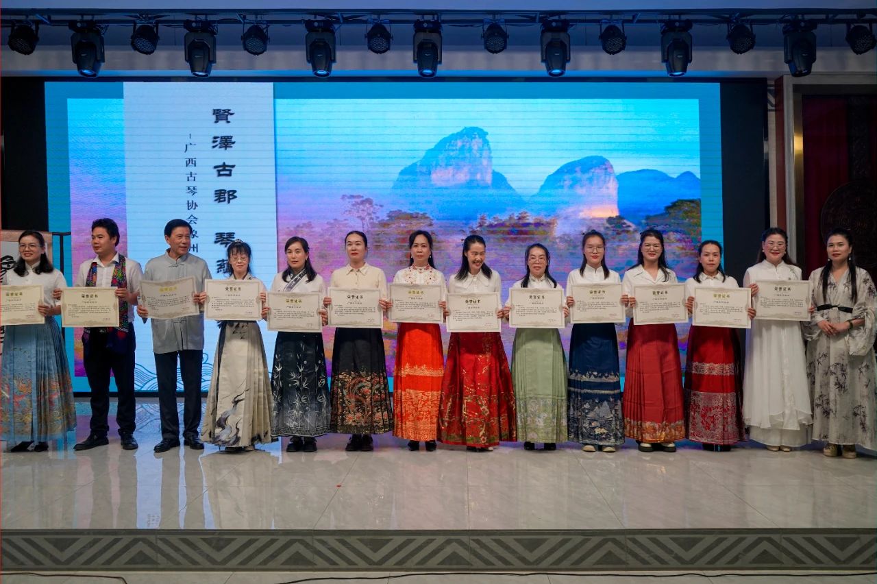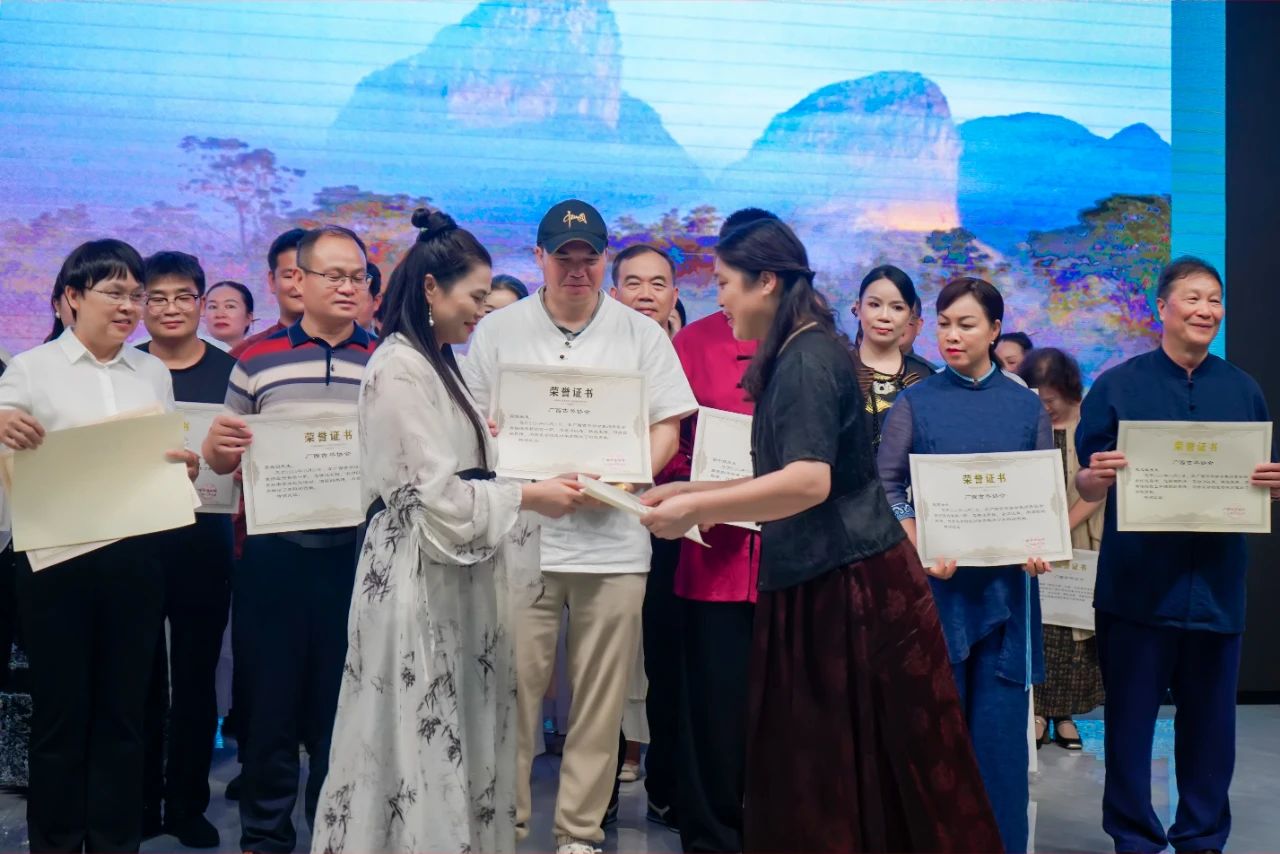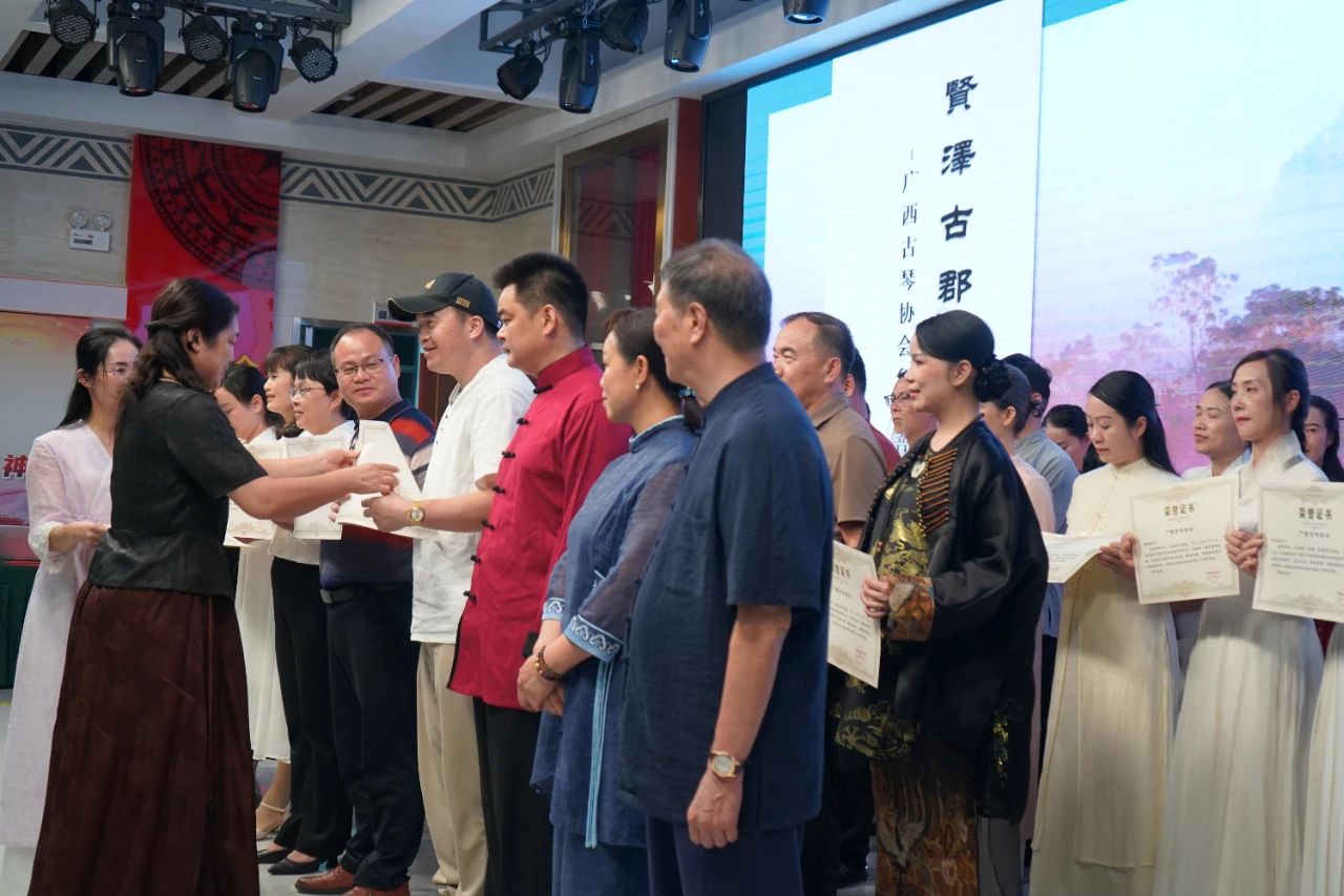 广西古琴协会会长李俊萍、象州县人大副主任,象州总工会主席吴银燕、广西古琴协会副会长朱文武、象州县总工会党组书记银中辉颁发荣誉证书。