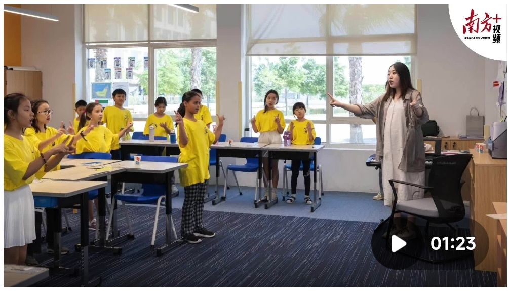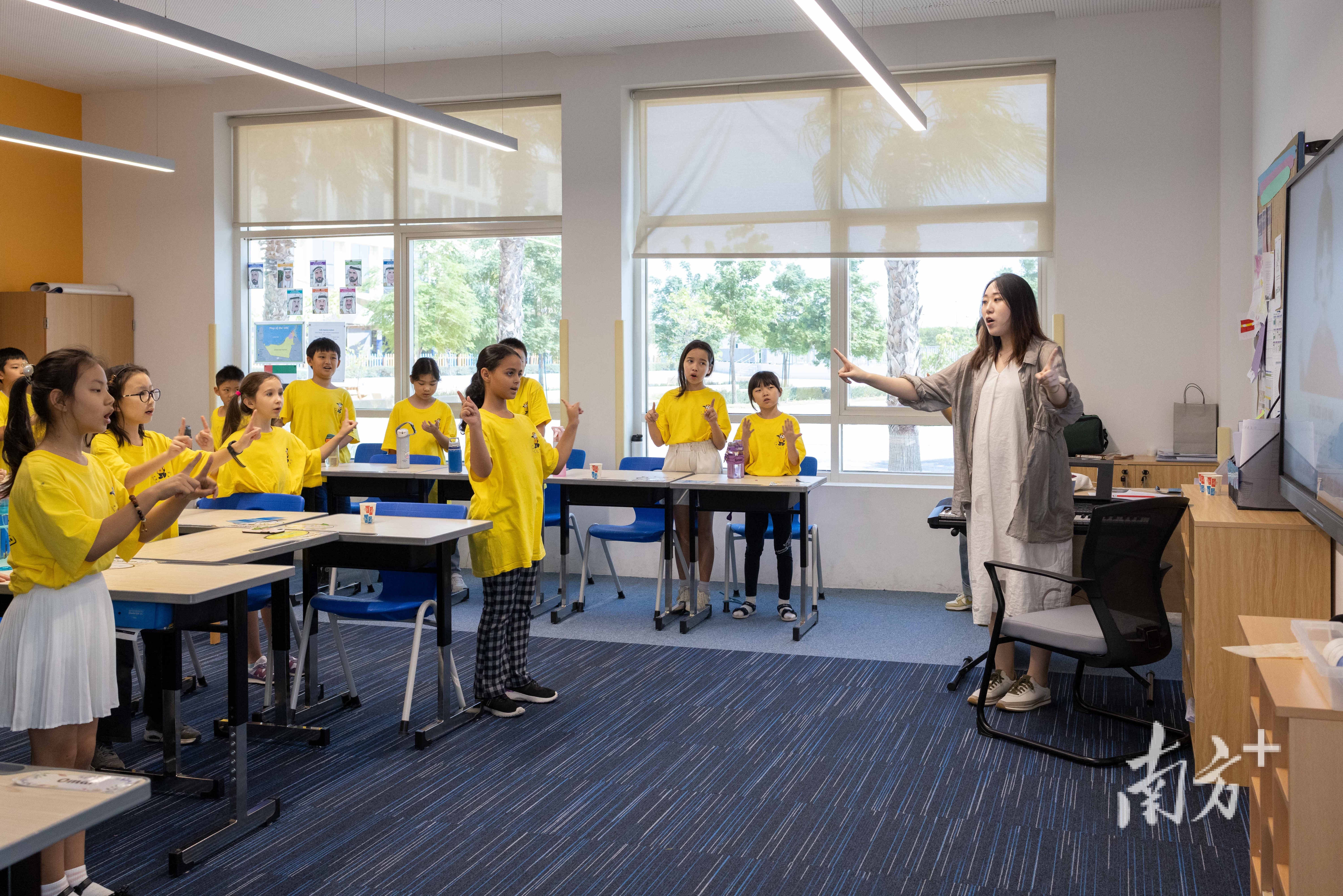 广东老师和迪拜学生一起跳手指舞。