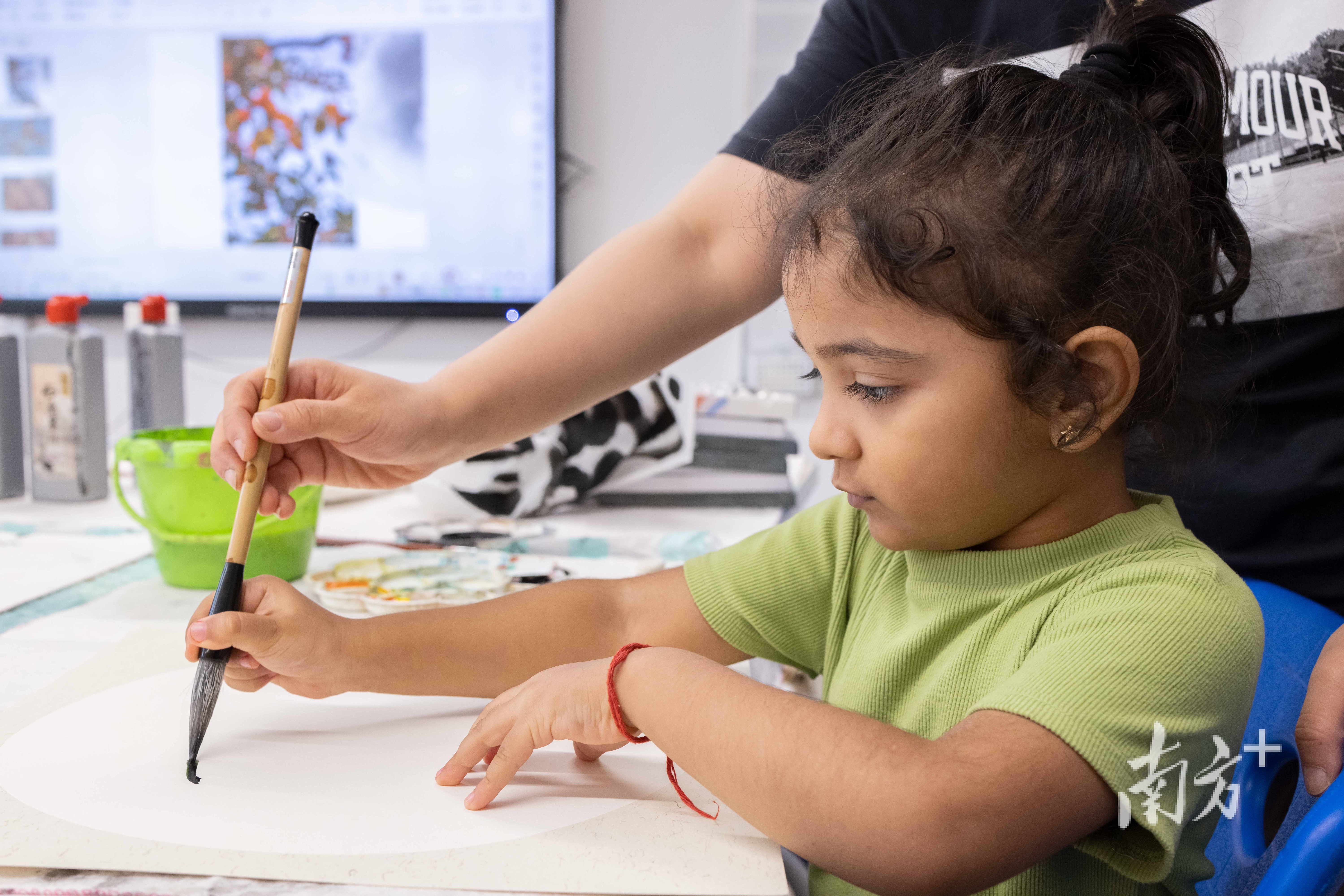 印度小朋友跟着中国老师体验书法。