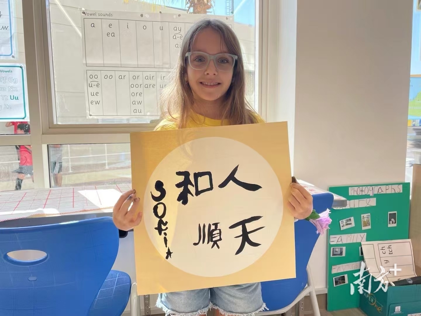 在迪拜一所国际学校,来自俄罗斯的苏菲娅展示她的书法作品。受访者供图