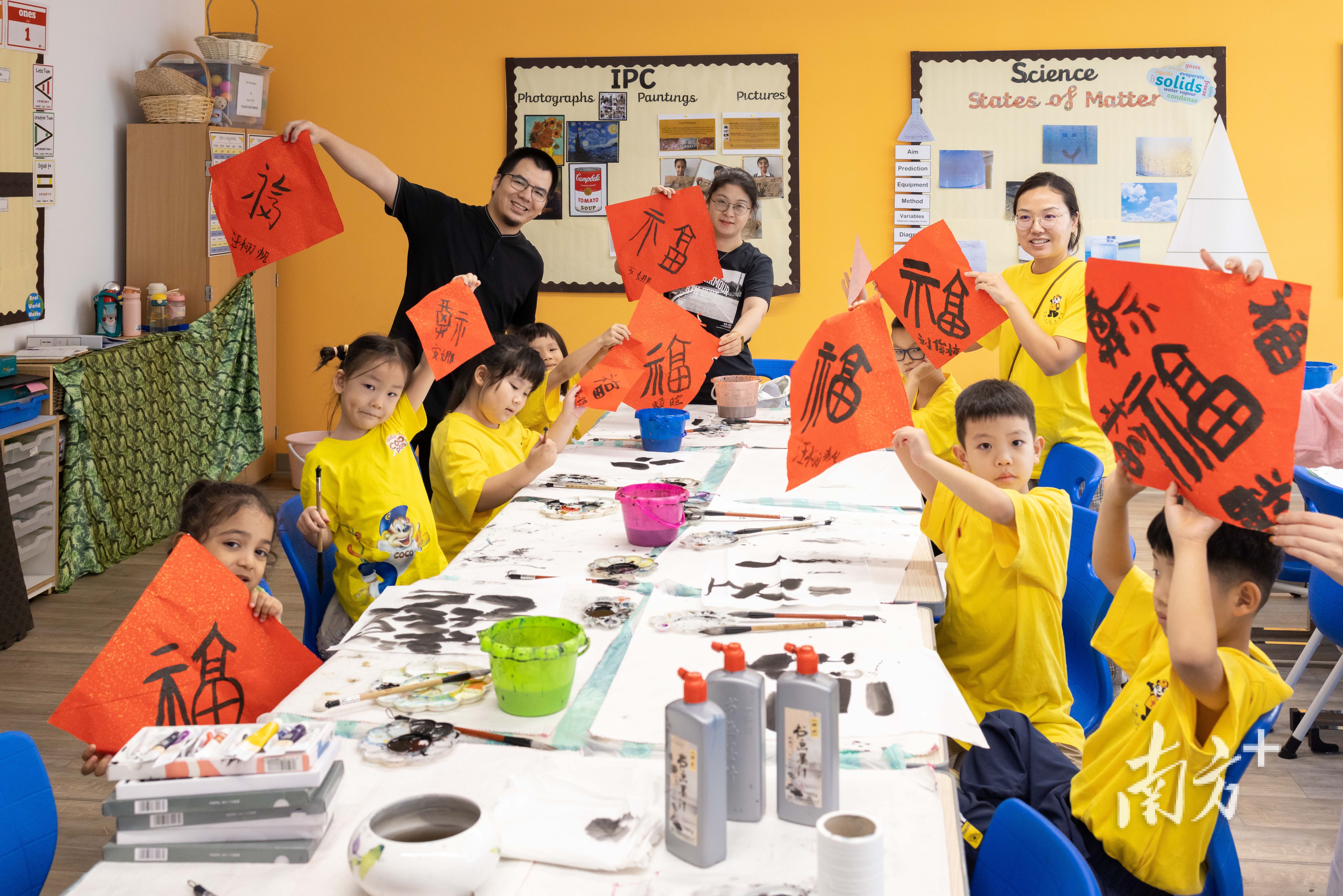 在阿联酋中华文化大乐园书法课堂上,来自广州的书法教师和当地的孩子们写福字,体验中国文化。