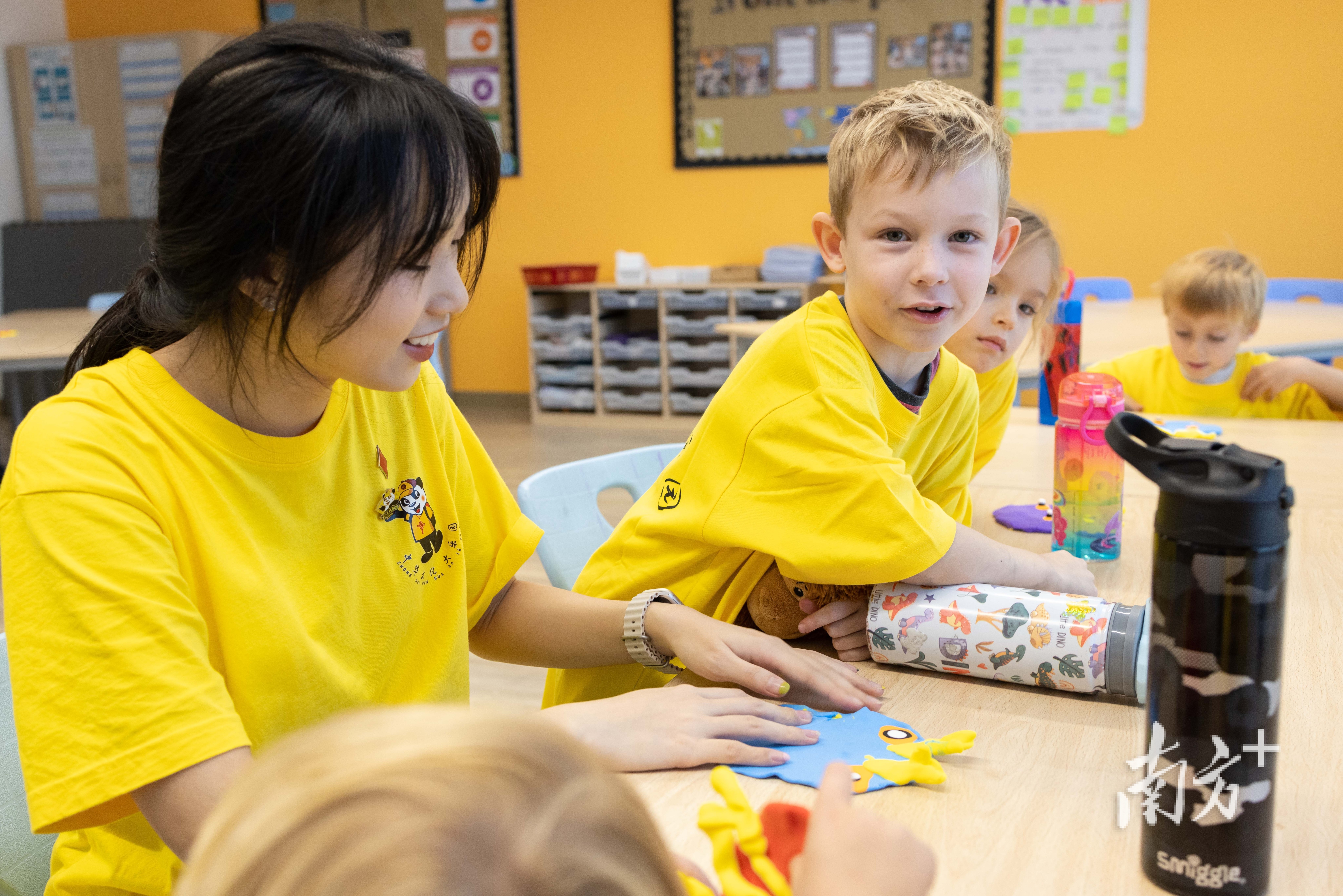 当地时间10月15日,在迪拜一所国际学校里,钟筱曼(左)和小朋友一起做手工。