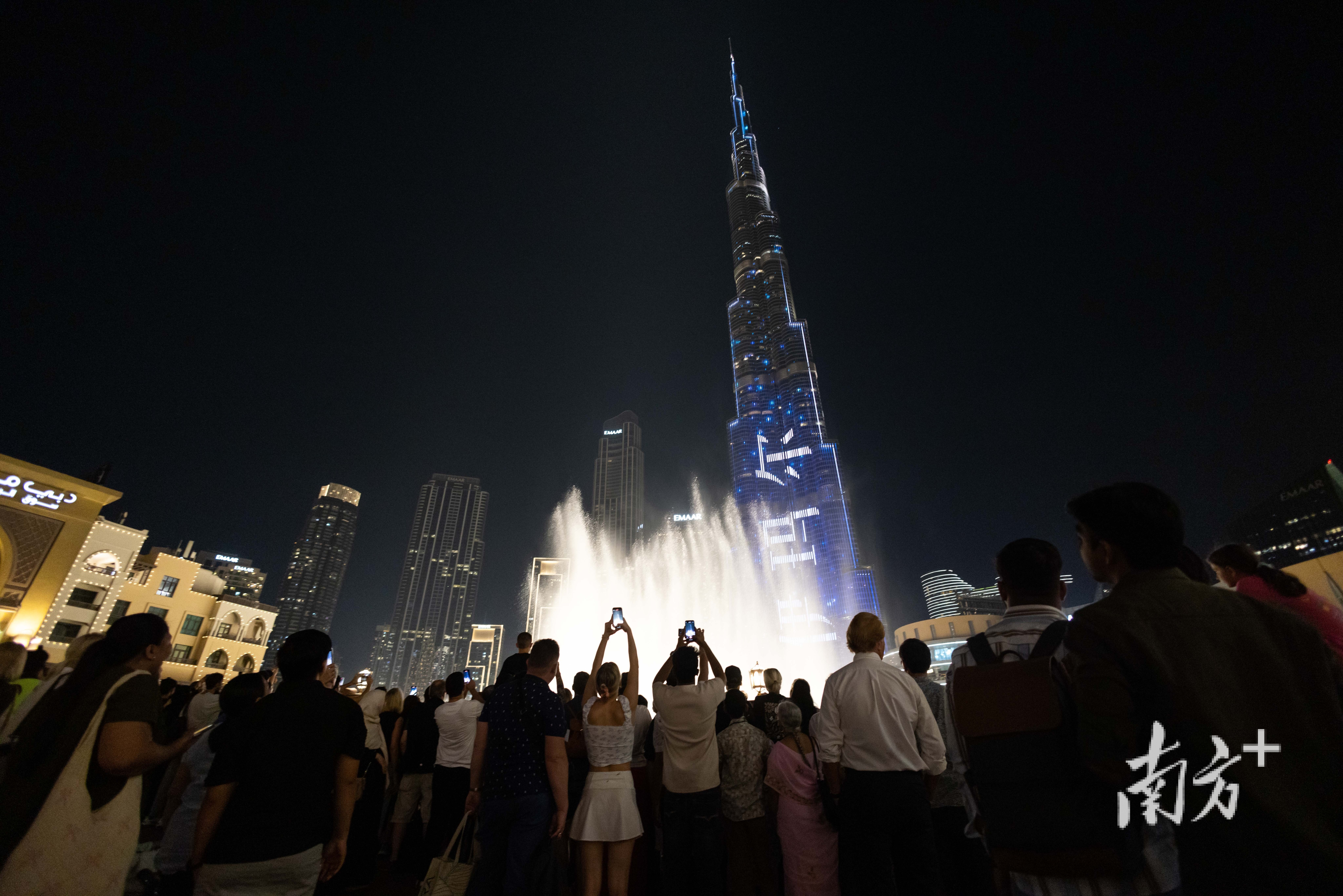 入夜后的迪拜地标哈利法塔下游人如织,塔上打着其开发者的中文名“伊玛尔”。