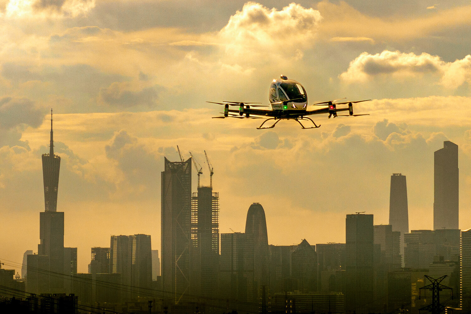 2024年7月11日,亿航智能无人驾驶载人航空器在广州上空进行飞行演示。在金色阳光的映衬下,飞行器与珠江新城构成一幅美丽的画卷。张令摄