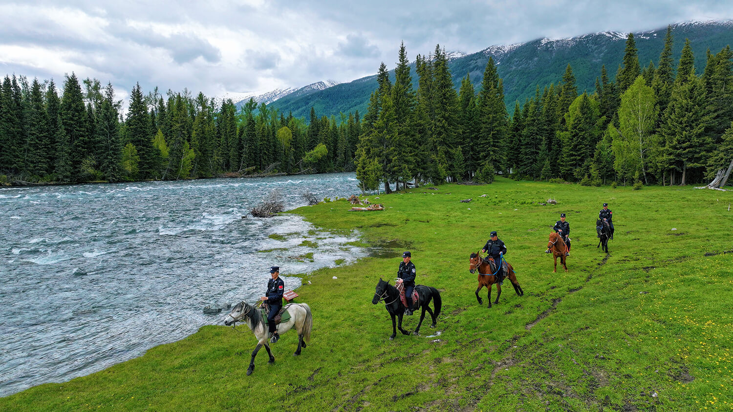 2024年5月27日,新疆阿勒泰地区,喀纳斯边境派出所民警正在骑马巡逻。张迪摄