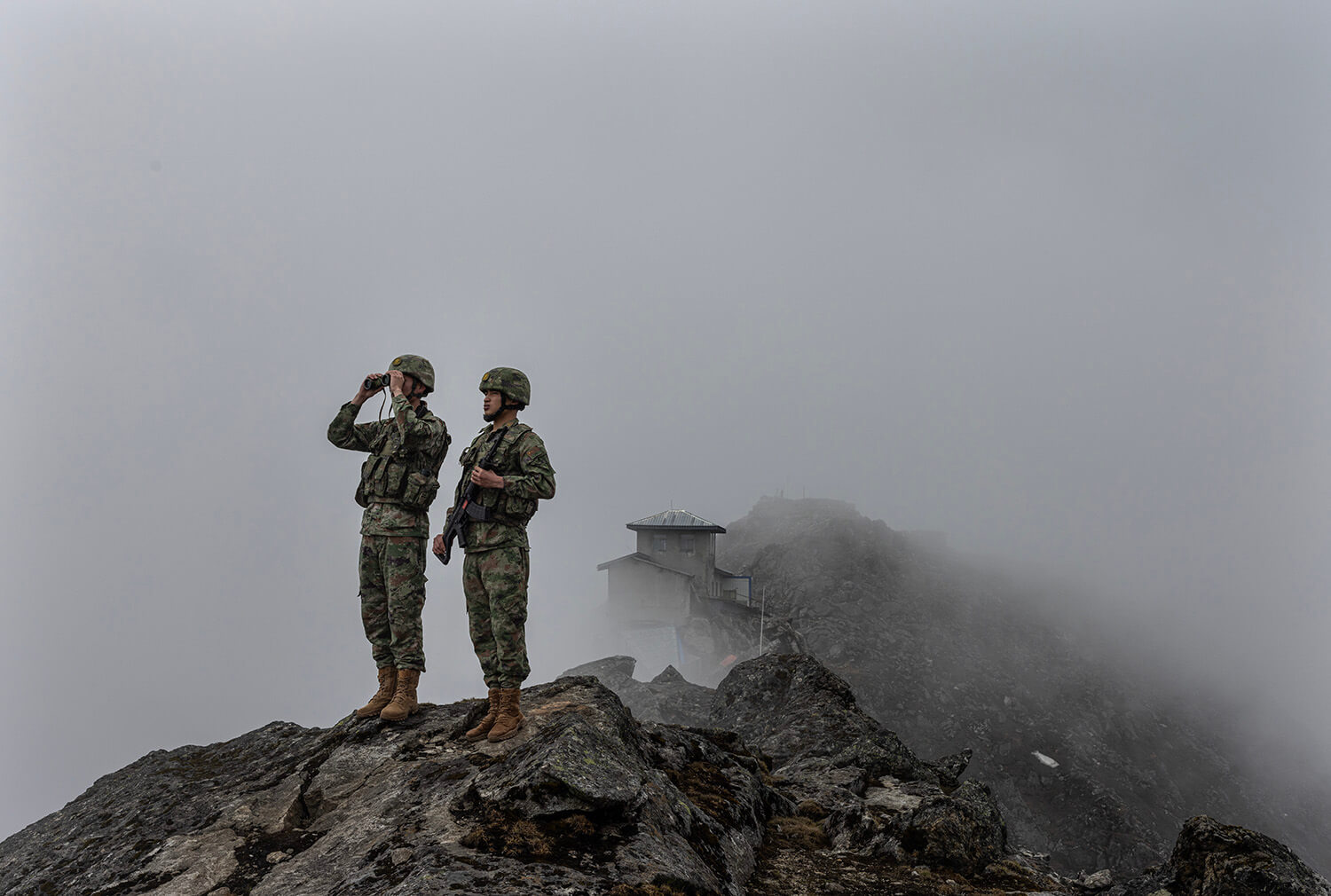 2024年6月4日中午,位于西藏日喀则的詹娘舍哨所,两名战士在云雾缭绕的悬崖边上执勤站岗。詹娘舍哨所位于喜马拉雅山脉南麓,藏语意为“连鹰都飞不过”的地方。张由琼摄