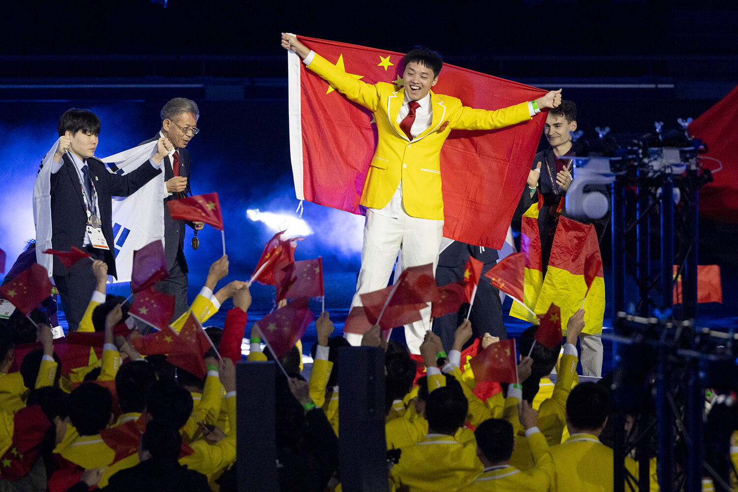 2024年9月16日,第47届世界技能大赛在法国里昂落下帷幕,来自广州市工贸技师学院的马贞鹏在移动应用开发项目中一举夺金,在冠军奖台上忘情地挥动着五星红旗。梁钜聪摄