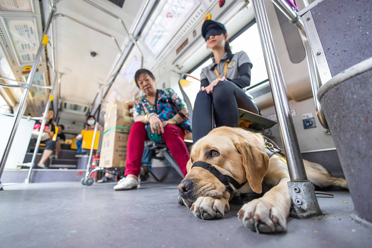 2024年4月24日国际导盲犬日,在广州“导盲犬主题巴士”9路车里,训练中的导盲犬与乘客同行。苏韵桦摄