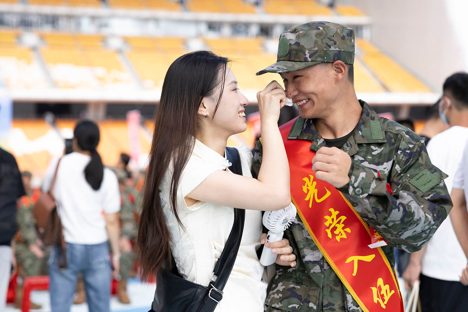 2024年9月18日,广州市秋季征兵入伍仪式现场,女生为即将奔赴军营的男友擦掉鼻子上的汗水。梁钜聪摄