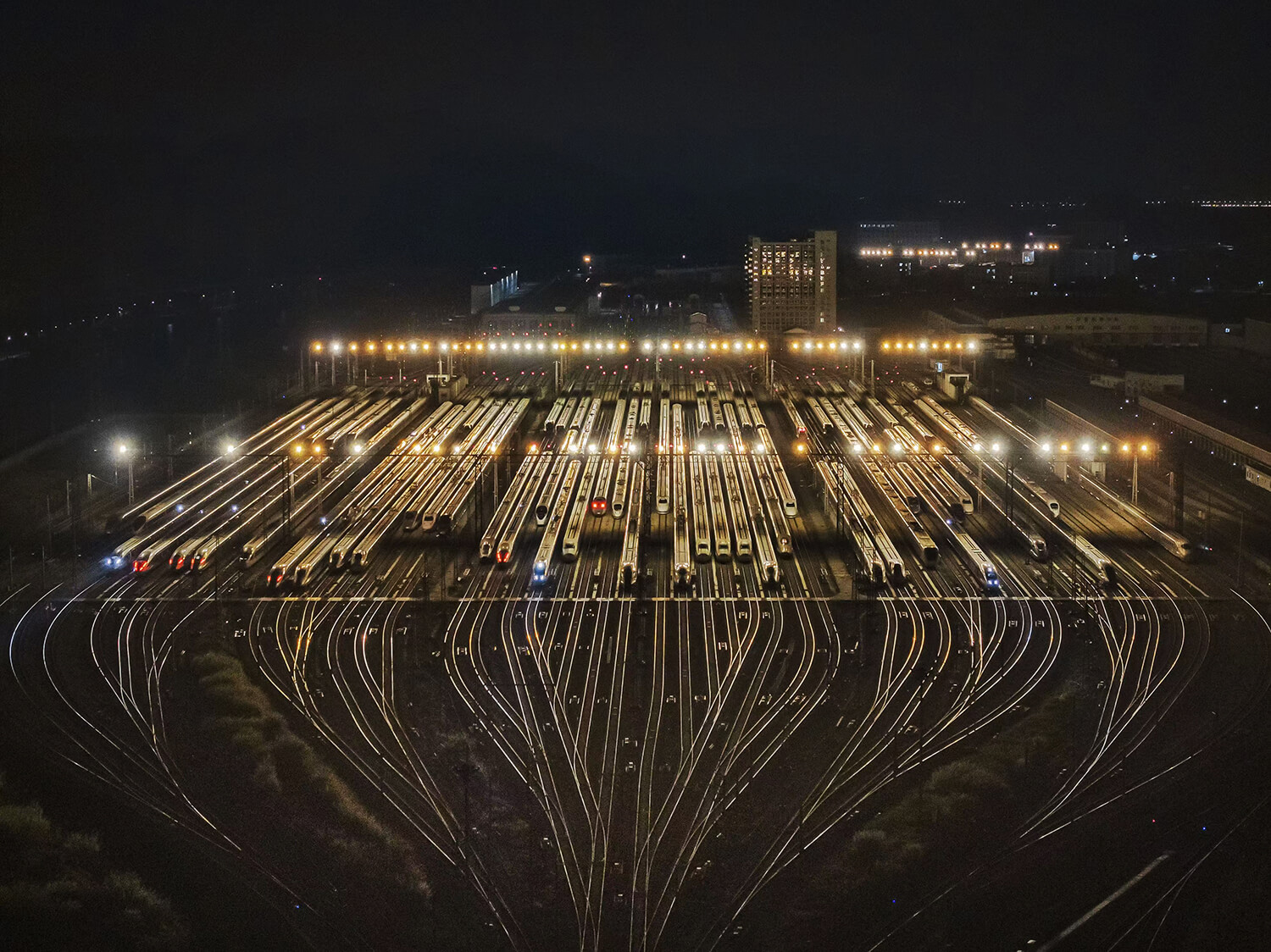2024年1月24日凌晨三点,广州动车段广州南动车运用所停满了已检修完成的列车,它们正等待着发车的号角,投入春运。石磊摄