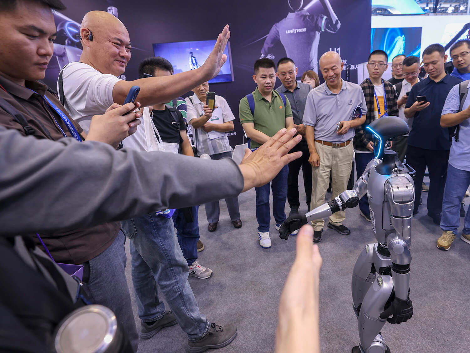 2024年11月14日,第二十六届高交会在深圳开幕,各式人形机器人堪称最大“显眼包”。图为宇树的国产全尺寸人形机器人与观众互动。朱洪波摄
