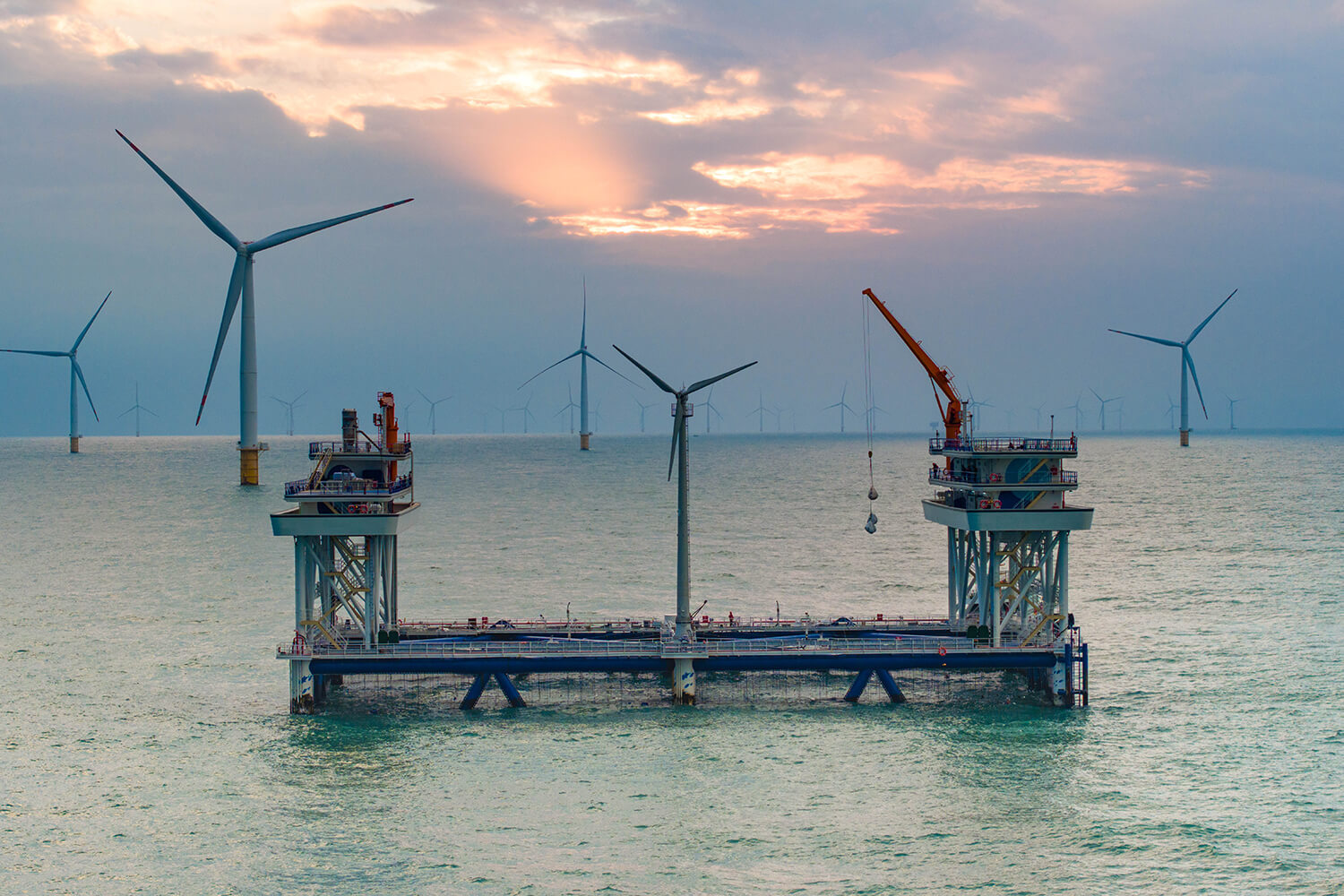 2024年11月25日傍晚,汕尾后湖风电场海域,全球首个抗台风型风渔融合网箱平台——“伏羲一号”和众多风机构成一幅美丽的画卷,海上“生绿电”,水下鱼满仓,发电和养鱼同时在“伏羲一号”上成为现实。张令摄