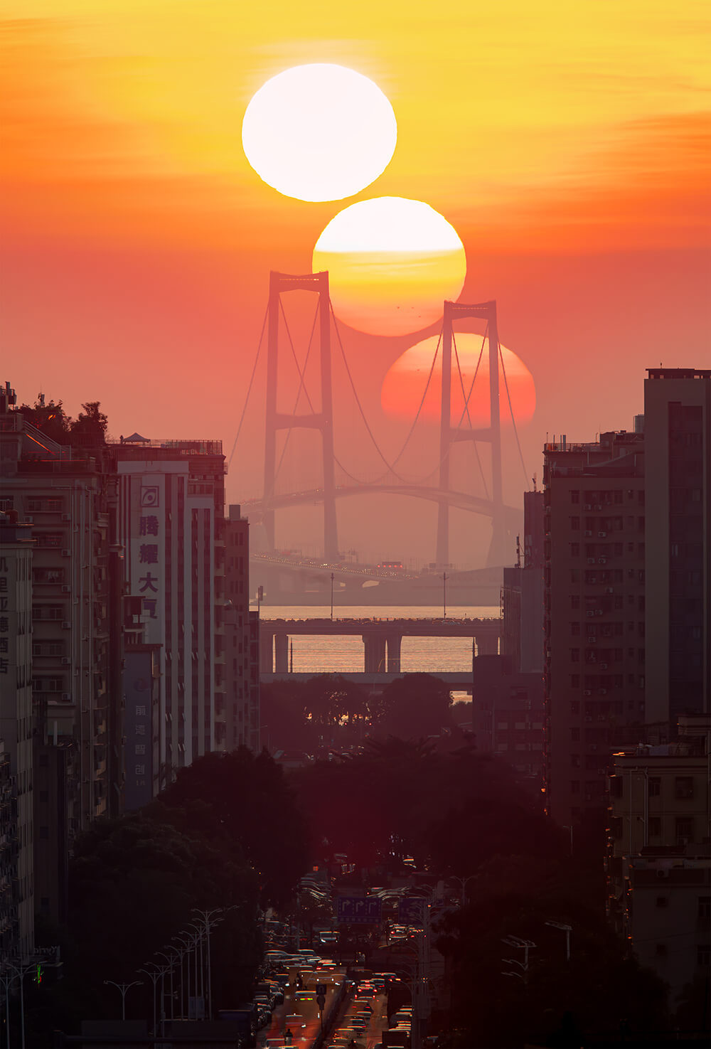 2024年12月1日傍晚,深圳西湾与远处的深中大桥及落日(堆栈生成)。金镝摄