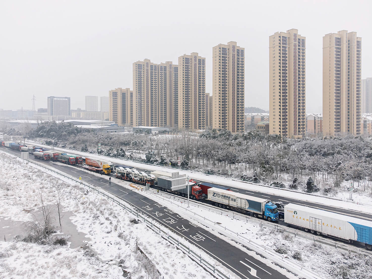 2024年2月5日,临近春节,受寒潮恶劣天气影响,湖北武汉京港澳高速由南向北路段车辆排起长龙。郑新洽摄