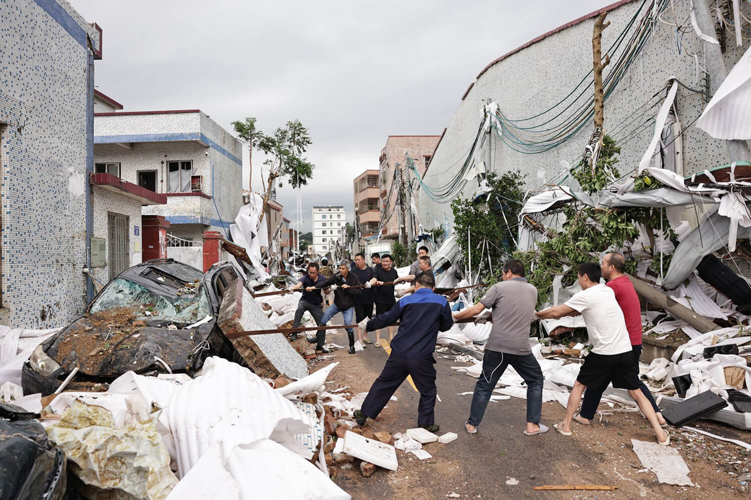 2024年4月28日,广州钟落潭镇光明村,一辆小汽车被龙卷风袭击,众人合力将障碍物清除。吴明摄