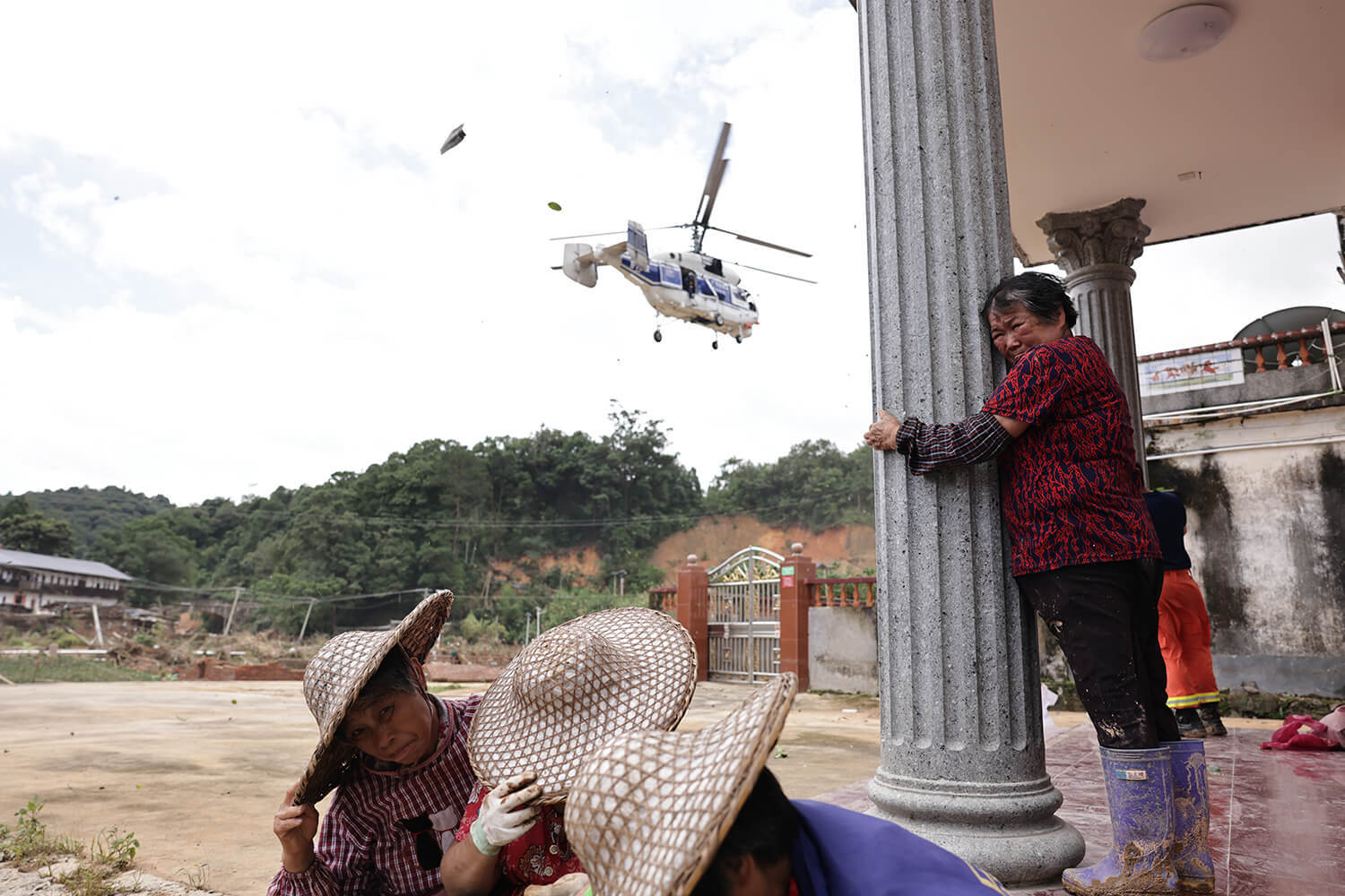 2024年6月16日暴雨后,梅州蕉岭县南磜镇,靠近北侧水库的多宝村多处道路塌方,停水、停电,进入村中的唯一通道223省道也多处中断,成为深山里的“孤岛”。6月19日,农妇们自发为直升机清出临时停机坪,使载有救援队的直升机安全降落在多宝村。吴明摄