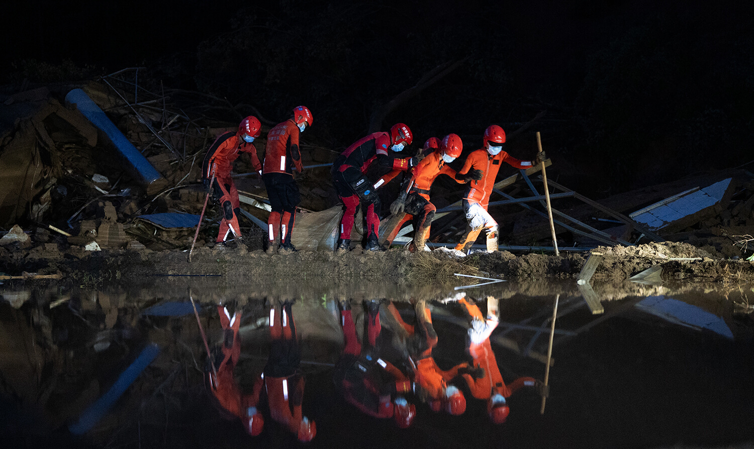2024年6月17日,梅州平远泗水镇大新村,救援人员趁着夜色搜索被困人员。董天健摄