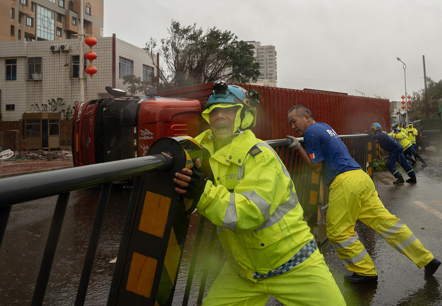 2024年9月6日,台风“摩羯”登陆湛江徐闻。9月7日,救援队员合力抬起徐海大道上的路障。南方日报记者钟志辉摄