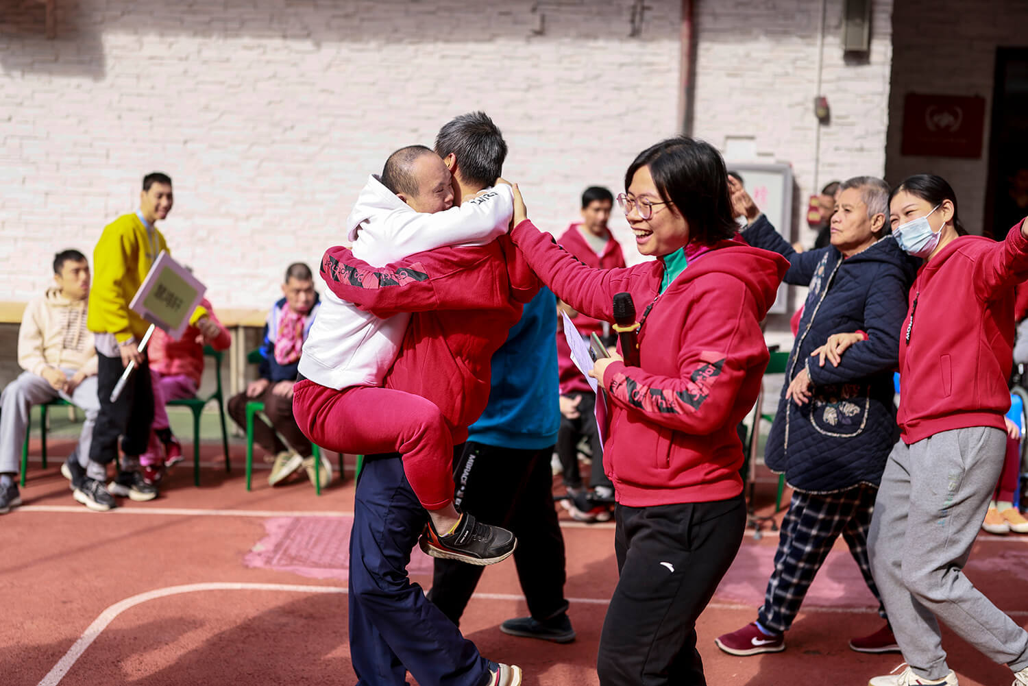 2024年1月11日,广州慧灵托养中心内正举行第一季度家庭技能大赛活动,大龄心智障碍学员们在老师们的帮助下,以家庭为单位走秀。