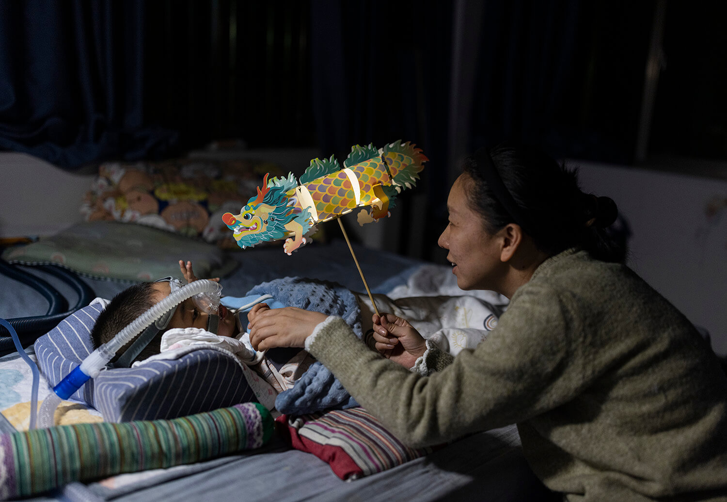2024年1月30日晚,临近2024年春节,杜佳拿着龙年的灯笼逗着戴着呼吸机的小“米粒”。2020年,半岁的小“米粒”被诊断患上了“SMA——脊髓性肌萎缩症”,全家花光积蓄还欠下高额债款;2021年,南方日报的报道为小米粒筹得73万元救治善款,当年底,诺西那生钠注射液被纳入医保,治疗SMA的药物从70万元一针降到了3万多元。