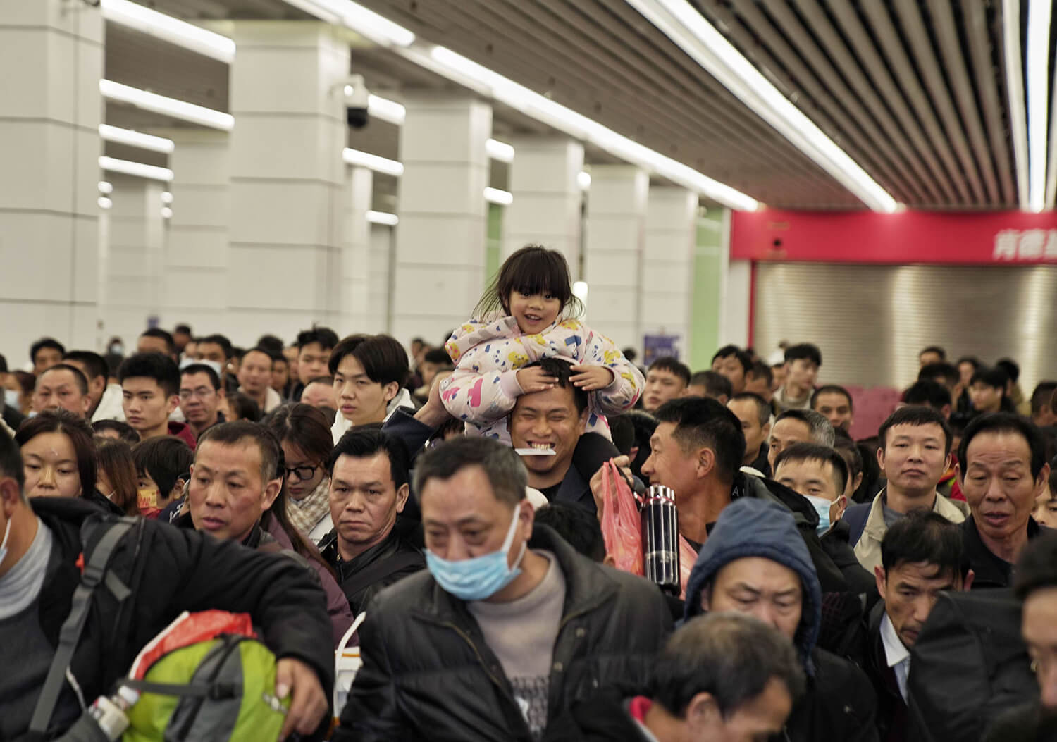 2024年1月26日凌晨,从广州站前往四川渠县的春运首班列车即将启程,一位父亲将女儿托举过头顶准备上车。石磊摄