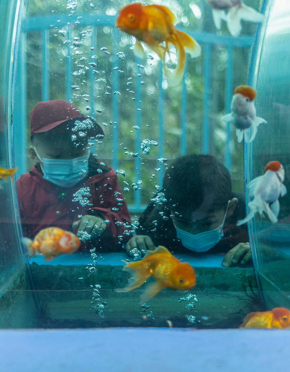 2024年2月5日,来自甘肃的马胜利和希悦在短暂出院后,来到广州动物园游玩,他们驻足在鱼缸旁,看着金鱼游来游去,这是他们人生中第一次进动物园。对于许多来自医疗资源有限地区的肿瘤患儿来说,去到大城市尤其是北上广异地求医,是全家最后的希望,然而不菲的医疗费用、较高的生活开支却使得部分并不宽裕的家庭陷入另一个困境中。张由琼摄