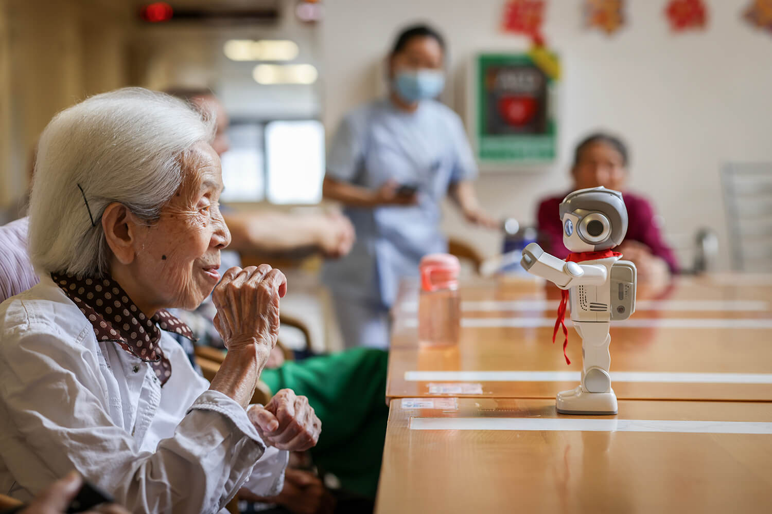 2024年6月5日,深圳市养老护理院每周五的机器人体验活动吸引很多长者参与。这是李奶奶看着机器人秀舞,90岁的她瞬间像个小朋友,也跟着舞动起来。朱洪波摄