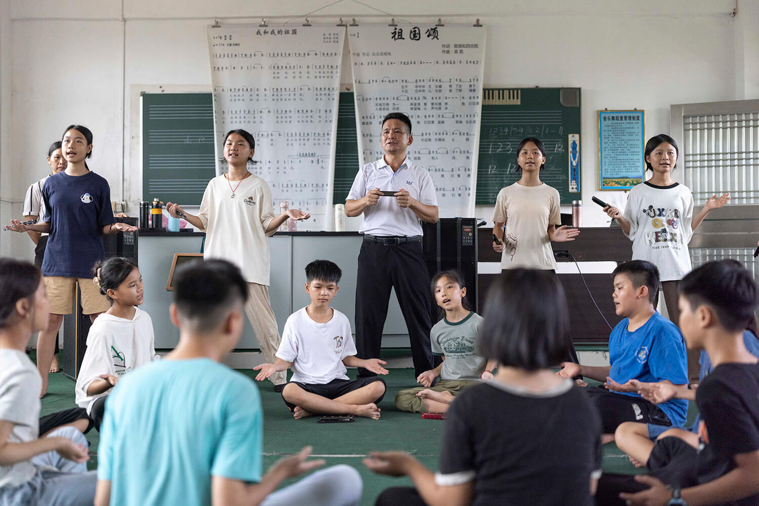 2024年7月18日,在茂名市黄阳小学的音乐教室,“口琴校长”邱立民(后排中间)与孩子们进行赴穗研学演出前的最后彩排。梁钜聪摄