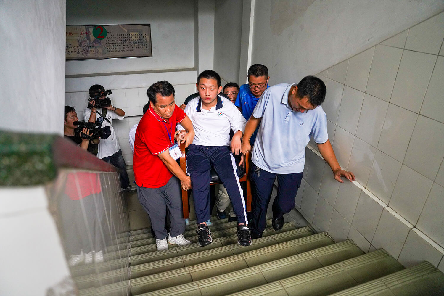 2024年6月30日,广州中考首日,广州市六十七中学迎来特殊考生,家长和老师暖心接力送考。许舒智摄