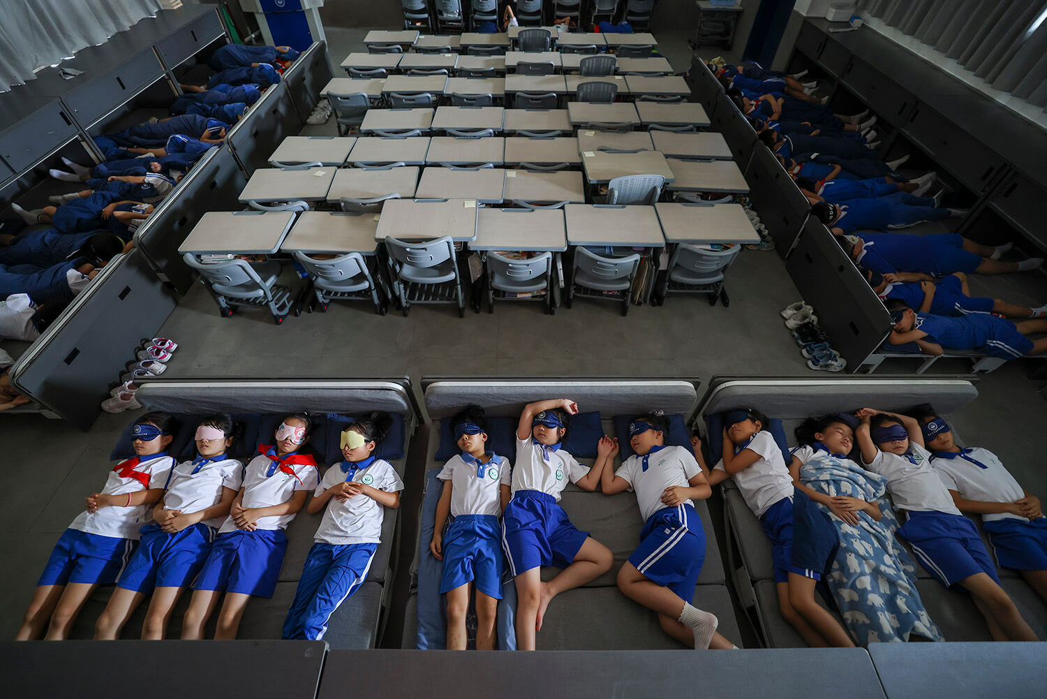 2024年9月4日中午12点30分左右,中山大学深圳附属学校三年级(8)班,学生们在可折叠午休床午睡,教室变身静悄悄的午休室。今年8月,由深圳市教育局发起的《中小学午休设备设施配备规范》地方标准在深圳市市场监督管理局官网正式发布,并于2024年9月1日正式实施。朱洪波摄
