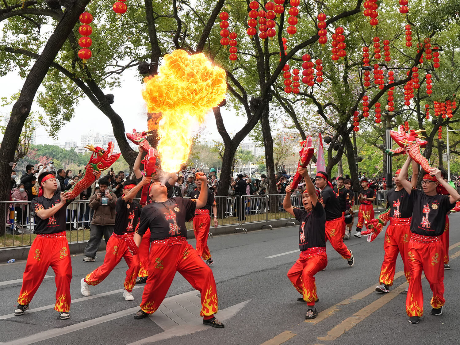 2024年2月24日,广东惠州,时值元宵节,龙舞大巡游活动中,来自中山西区的醉龙队为当地民众展示国家级非遗项目醉龙中的经典表演“醉龙喷火”。仇敏业摄