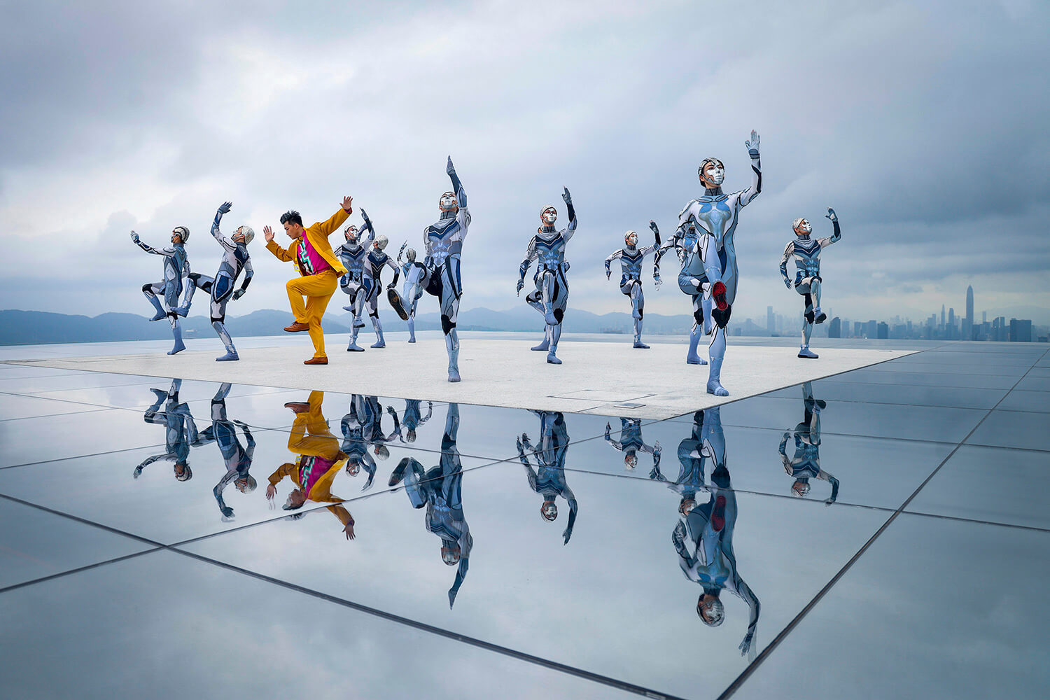 2024年4月27日,在深圳最高的露天观光平台深湾睿云中心80层“天空之境”,深圳设计周活动现场演绎人工智能题材舞剧《深AI你》。朱洪波摄