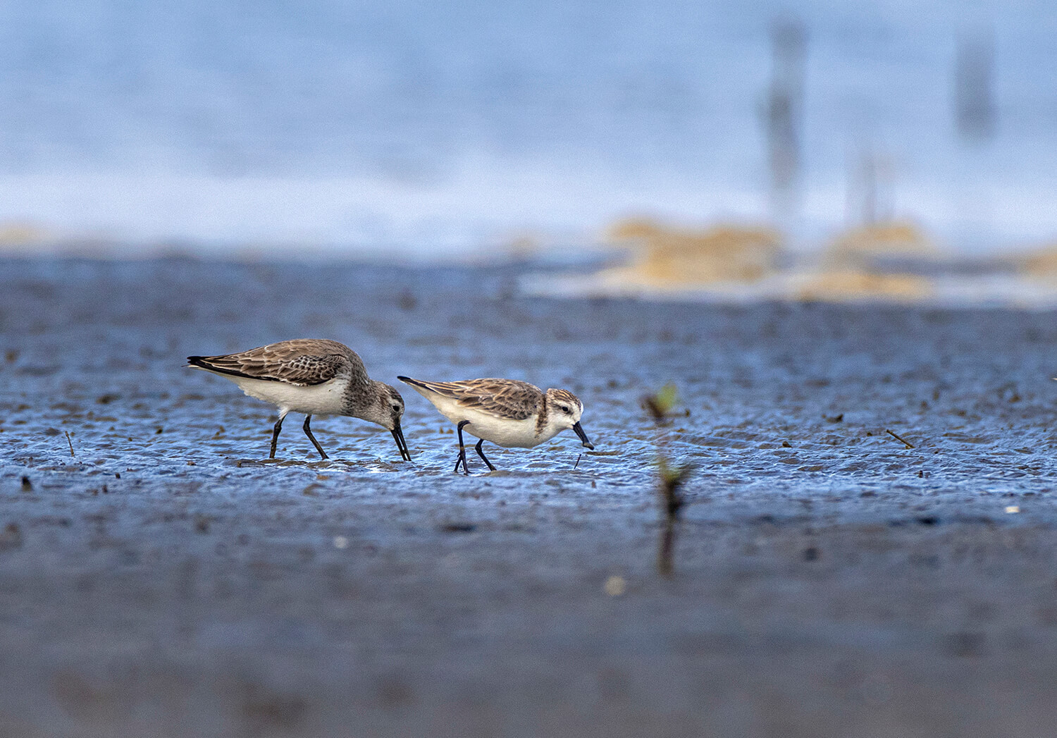 2024年1月7日,湛江雷州附城镇土角村的滩涂地上,一只勺嘴鹬(右)与其它鹬鸟正在觅食。这种“自带饭勺”的小鸟是世界上最稀有的鸟类之一。张由琼摄