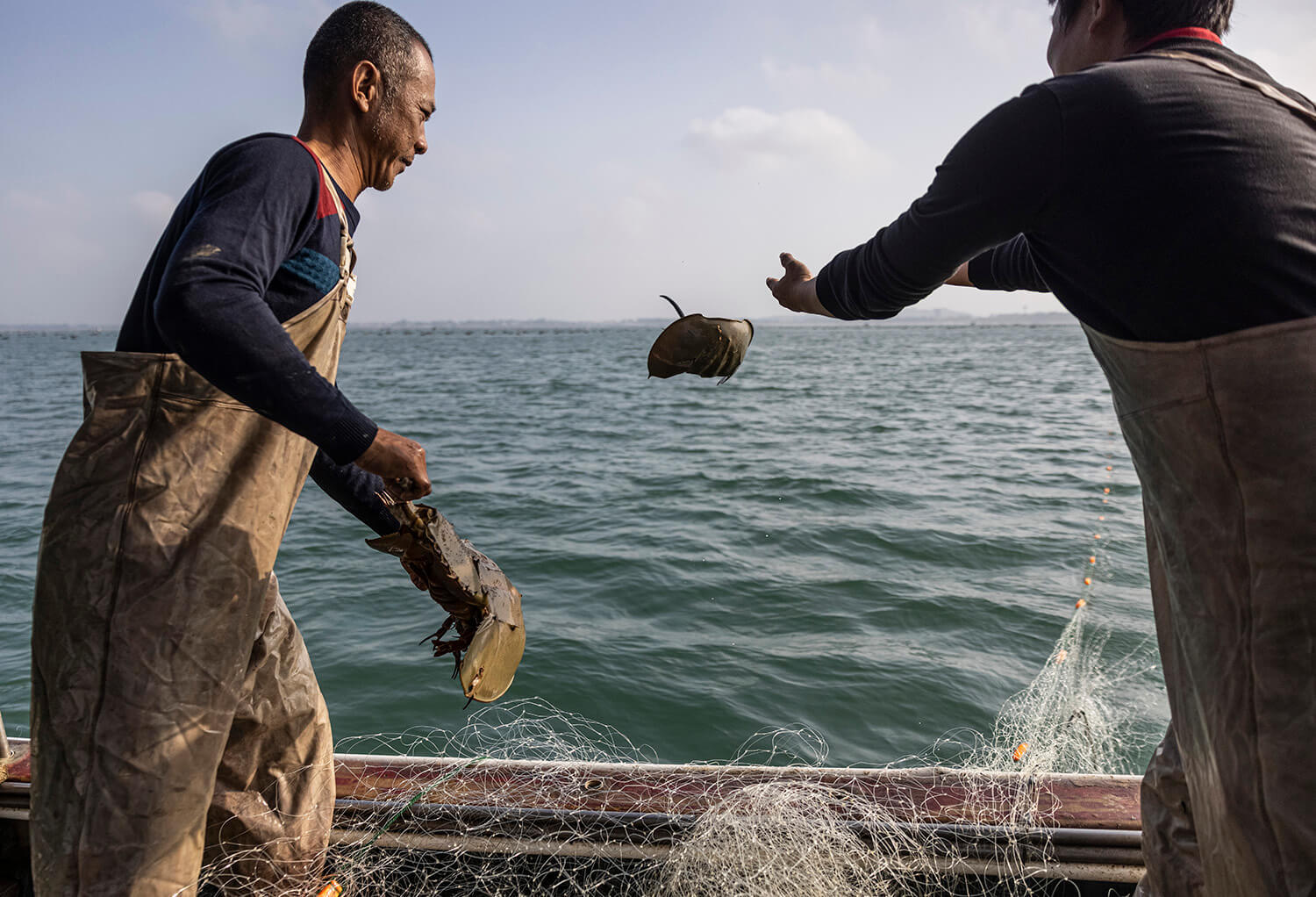 2024年1月8日,湛江雷州半岛海域,正在作业的渔民不小心误捕到鲎,立即解网放归大海。鲎比恐龙更古老,被称为“地球历史见证者”。由于过度捕捞和利用、栖息地丧失、气候变化等因素,近40年来鲎的数量急剧减少。张由琼摄