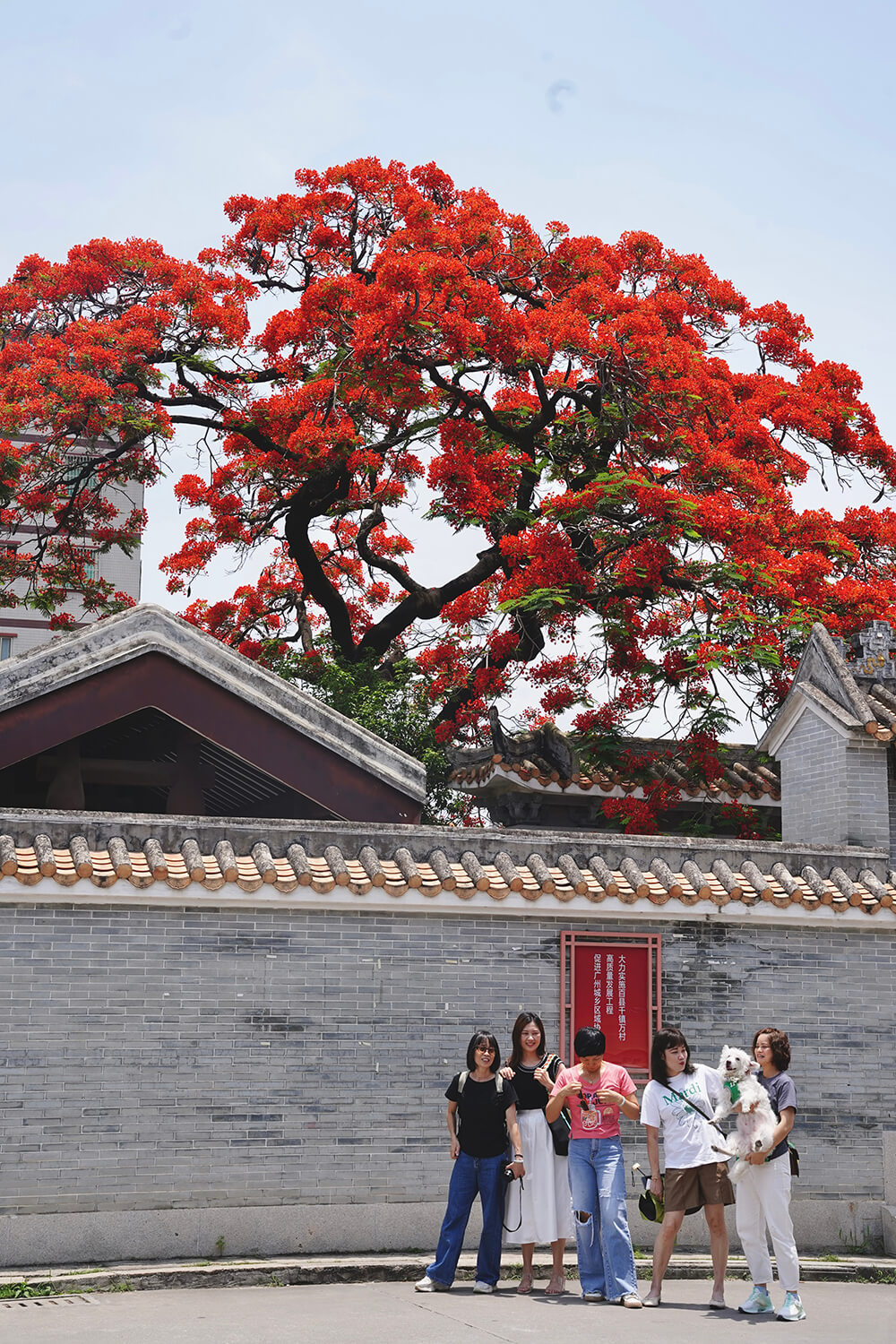 2024年5月20日,广州白云区龙归街南村村的周氏大宗祠内的一株古凤凰木正玉英怒放,花朵灿若云霞、红彤似火,与古祠堂的镬耳、灰塑交相辉映,吸引不计其数的市民、游客前来打卡留念。杨奇摄
