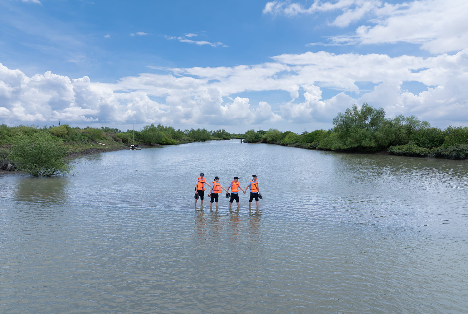 2024年8月15日,全国唯一专职保护红树林的派出所——广东省公安厅森林公安局湛江红树林派出所有4名在职民警,他们负责守护2万多公顷的湛江红树林国家级自然保护区。8月15日全国生态日前夕,他们涉水前往麻章区湖光镇料村一海边养殖塘,查看红树林复种情况。张梓望摄