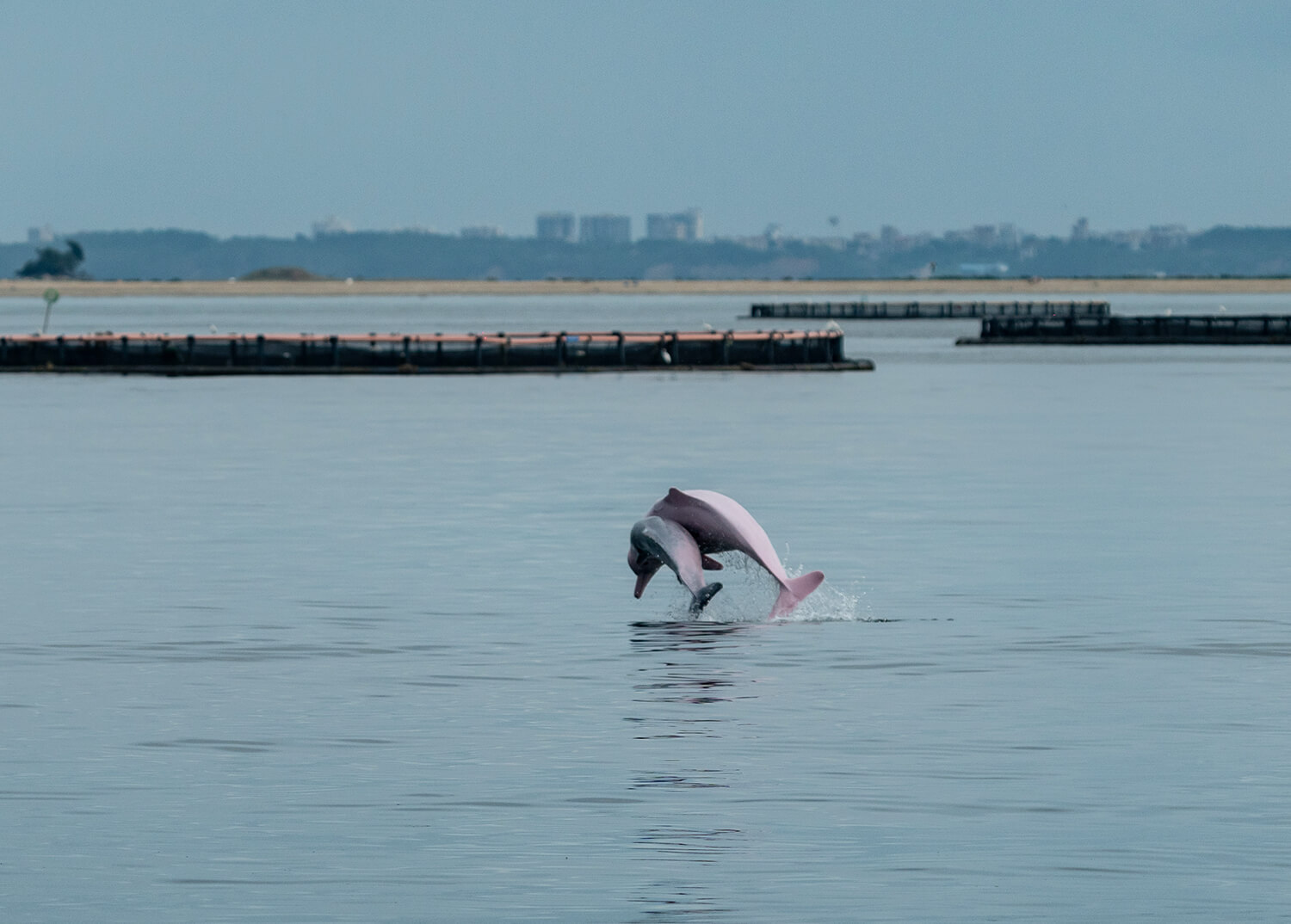 2024年8月15日,湛江市东海岛海洋牧场旁,成年中华白海豚带着一只幼年体双双跃出水面。钟志辉摄