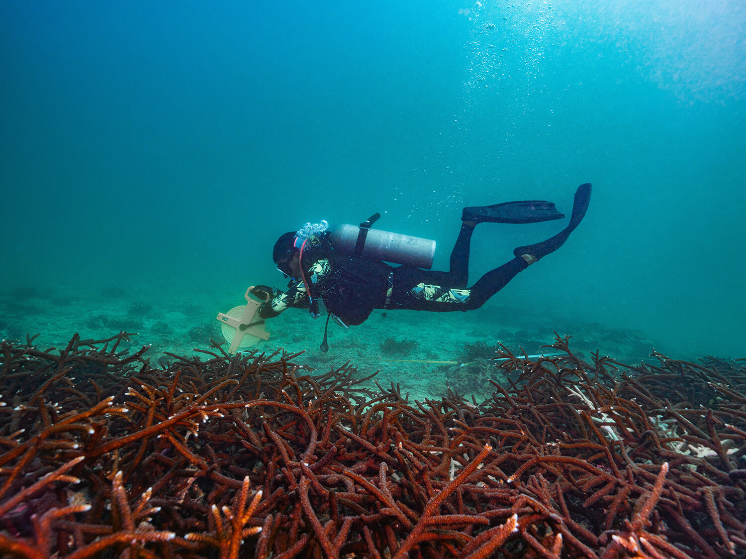 2024年9月2日,广东珠海外伶仃岛海域,大面积的国家二级保护动物:佳丽鹿角珊瑚长势喜人,科研人员沿着边缘测量珊瑚面积。石磊摄