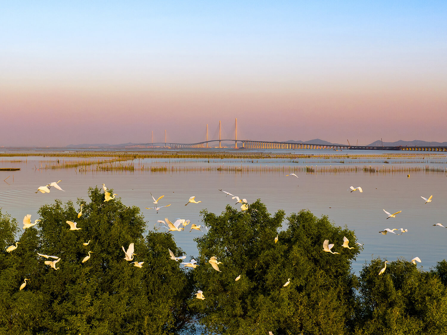 2024年11月30日,黄茅海跨海通道江门一侧,鹭鸟成群结对在此嬉戏,与远处的大桥相映成趣。石磊摄