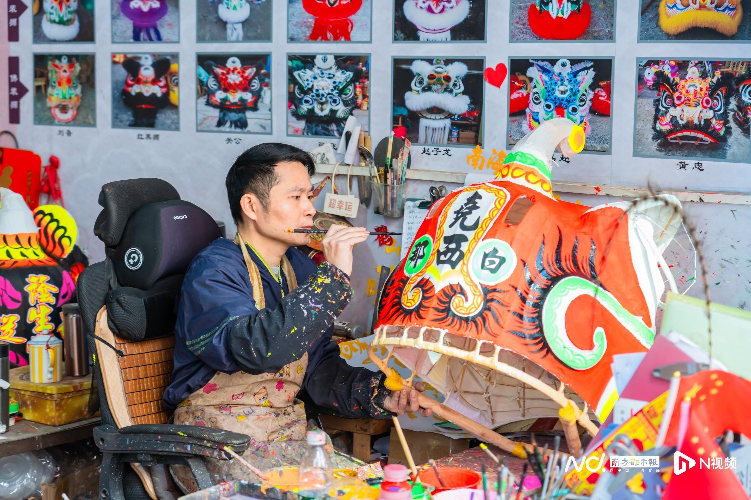 毛边、金框、绒球等用品摆放乱中有序,等待着被装饰到狮头上。工人用笔轻蘸颜料桶,在狮胚上勾勒出花纹,围裙和地面,全是缤彩的星点颜料。